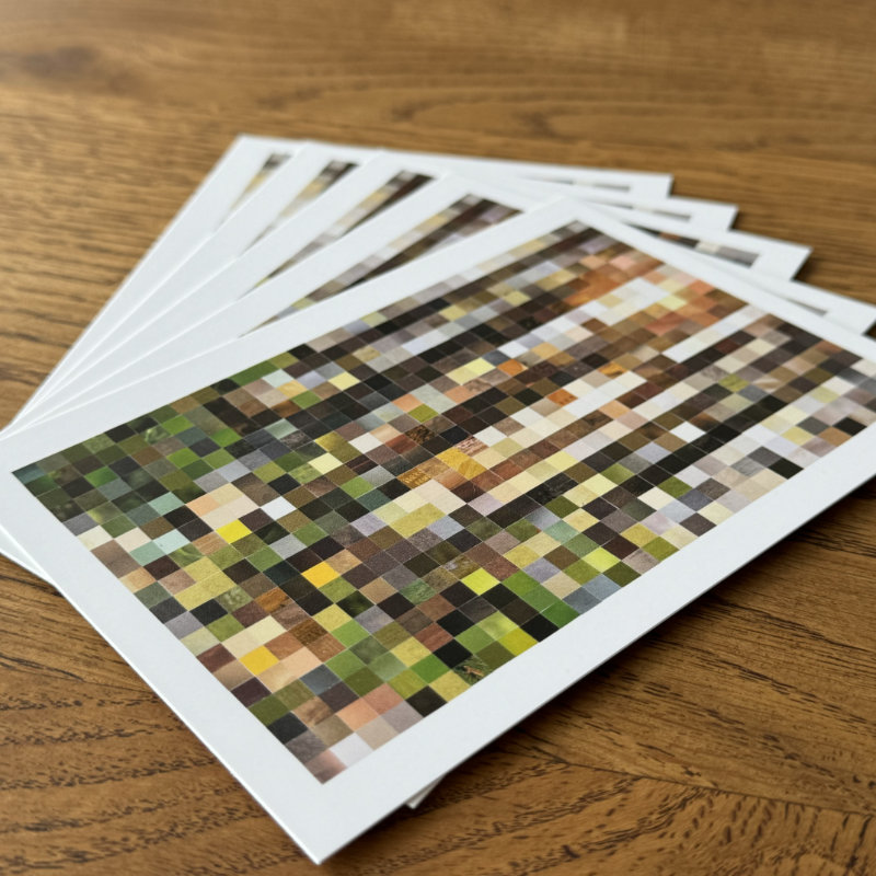 fünf postkarten unseres upcycling-projekts 'aus quadraten'.